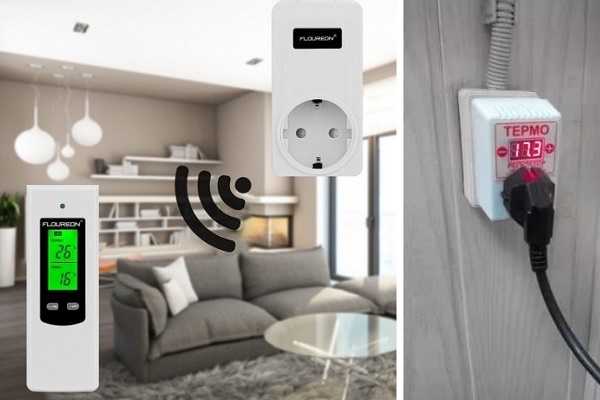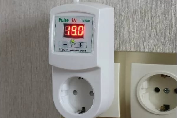 Le thermostat de prise ressemble à une prise d'adaptateur ou à une superposition. Au dos, il a une fiche pour se connecter au réseau, et à l'avant il y a une prise dans laquelle la fiche du chauffage domestique doit être insérée.