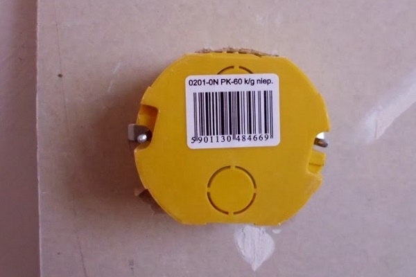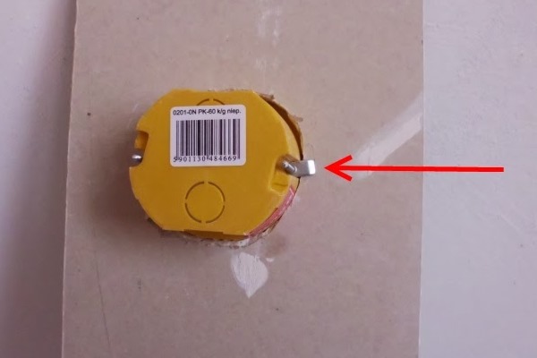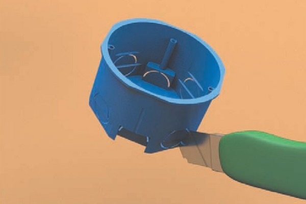 La rosette doit également être préparée. Retournez-le avec le côté inférieur, où se trouvent les fentes pour les fils et coupez l'un d'eux avec un couteau. Nous y avons mis un fil et inséré la boîte dans le mur pour vérification.