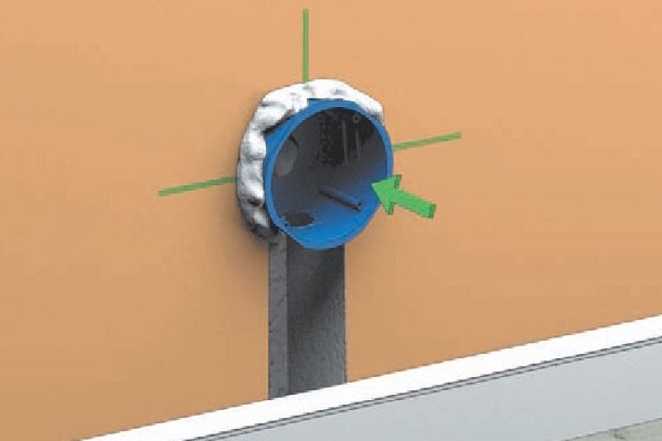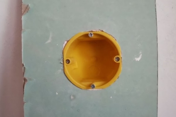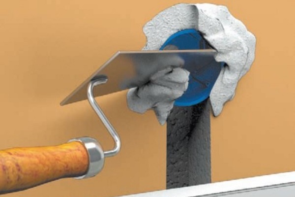 Deux minutes avant de mettre la boîte dans le mur, le trou est mouillé avec de l'eau. Une fois le liquide absorbé, une couche de gypse est appliquée sur ses parois avec une spatule. Un fil est enfilé dans le verre, sa partie arrière est également enduite d'une solution, et le sous-bois est inséré dans le trou.