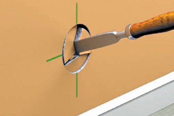 Avant d'installer le socket, effectuez le balisage comme décrit ci-dessus. Il est beaucoup plus facile de faire un trou dans une cloison sèche que dans un mur en béton. Vous pouvez simplement couper un cercle avec un couteau ou percer un contour avec une perceuse, puis le couper avec le même couteau.