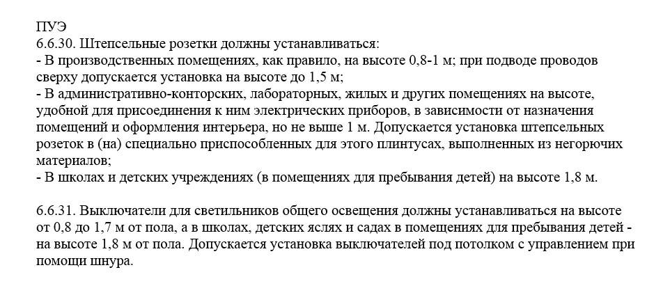 Le PUE, en passant, n'oblige pas à suivre les normes étrangères, et les exigences pour le placement des prises, interrupteurs, sont très "démocratiques". Pour les locaux résidentiels, les Règles recommandent la hauteur des prises, en tenant compte de l'intérieur, de la commodité, de la destination. Certes, une hauteur de plus d'un mètre est considérée comme peu pratique. Ici pour les écoles, les jardins d'enfants, la hauteur de la sortie est régulée à 1,8 mètre. La hauteur des disjoncteurs est encore moins limitée.