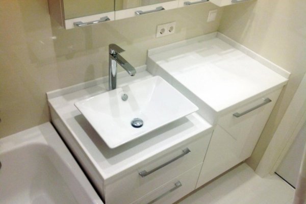 Si un lavabo avec un comptoir est installé dans la salle de bain, vous pouvez envisager une solution intéressante et pratique avec un module caché. Le bloc de sortie est caché dans la table et seul l'élément sort, pour lequel il peut être facilement retiré.