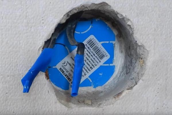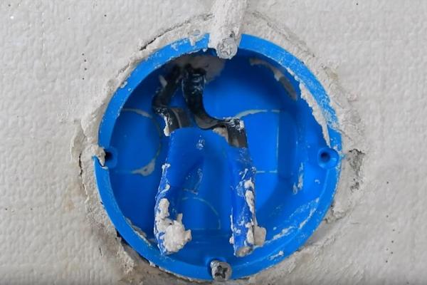 Les boîtiers de montage sont placés sous le plafond à une distance réglementée par les règles, et les fils en sont descendus verticalement jusqu'au lieu d'installation de la prise.