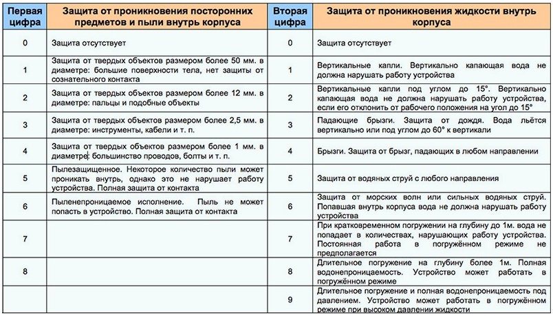 Pour la salle de bain, les deux valeurs numériques sont pertinentes. Le premier indique le degré de protection contre les particules solides et la poussière, le second - contre l'humidité. Les experts recommandent des appareils avec des marquages sur les deux paramètres d'au moins 4, mais de préférence 5 ou 6.