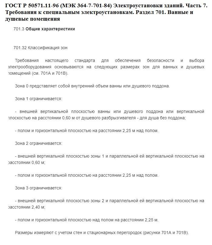 Bonjour, Elena. L'installation des prises est scrupuleusement décrite par les «Règles pour l'installation des installations électriques» et la section n ° 701 de GOST R 50571.11-96 - ils écrivent juste sur les salles de bains et les douches. Le PUE, en commençant la section sur l'équipement électrique des baignoires, douches, attire l'attention sur le fait que les appareils doivent respecter les zones définies par GOST, et énumère les zones et le degré de protection des équipements qui leur sont destinés (zones) (ci-joint une capture d'écran).