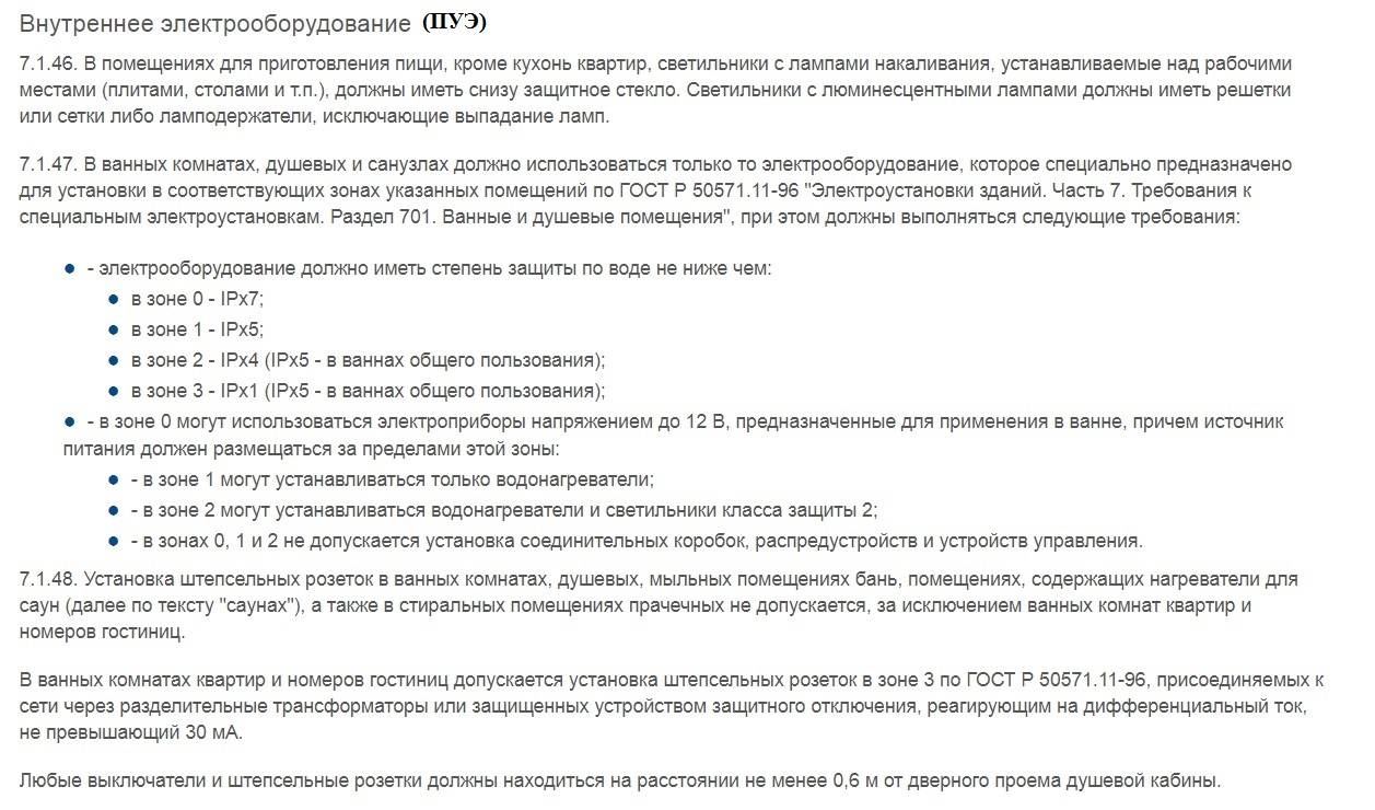 Les nouvelles modifications des appareils électriques sont conçues pour fonctionner dans des pièces très humides. Mais pour eux et pour les prises sont des exigences accrues. Vous pouvez clarifier les informations légales dans les documents réglementaires, par exemple, dans GOST R 50571.11 (1996) et PUE (7.1).