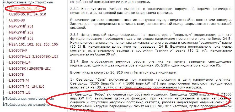 Avec un compteur électronique, la situation est différente. J'ai pris au hasard un passeport monophasé à tarif unique CE101-R5. Les instructions indiquent qu'il y a un indicateur informant de la «puissance inverse» (capture d'écran ci-jointe).En d'autres termes, le compteur, si la phase est mélangée et zéro avertira qu'une erreur a été commise. Il s'avère que cela ne brûle pas non plus. Si d'autres types de compteurs sont intéressants, je vous conseille de regarder les passeports.