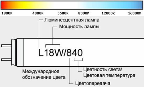 Les lampes fluorescentes sont étiquetées conformément aux normes internationalement reconnues. Trois derniers chiffres sur ampoule à mercure - chiffrement du rendu des couleurs et de la température des couleurs.