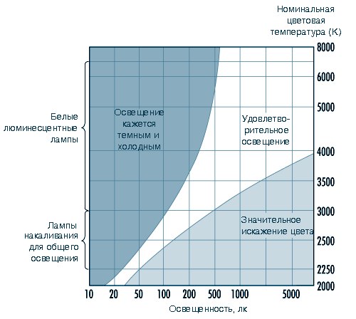 Par exemple, une lampe avec un indice CT de 2700 K, émettant un flux lumineux de 200 Lx, crée une lumière confortable. Cependant lampe de table avec deux fois la puissance et la même température de couleur, il semble trop jaune et commence rapidement à gêner.