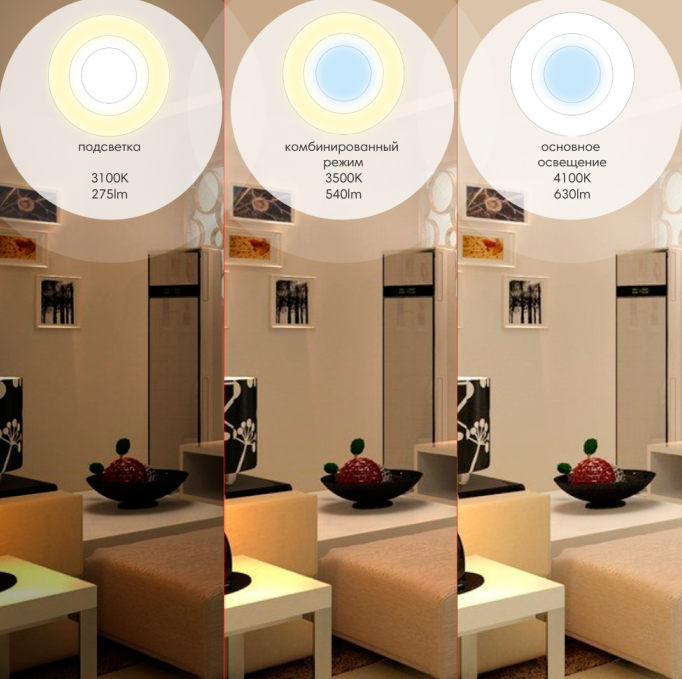 Quant au tabou sur l'utilisation dans une même pièce (simultanément) de sources lumineuses avec des températures de couleur différentes, il n'est pas si strict, une différence de pas plus de 1000 K est tout à fait acceptable. Surtout quand il s'agit de plafonniers.