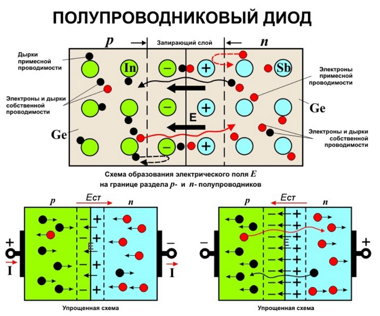 En raison de cette polarité, les électrons de la zone de type P se précipitent vers la zone de type N, et vice versa, les charges de la pointe du point N à P. Cependant, chaque section de la région a ses propres limites, appelées jonctions P-N. Sur ces sites, des particules sont trouvées et mutuellement absorbées ou recombinées.