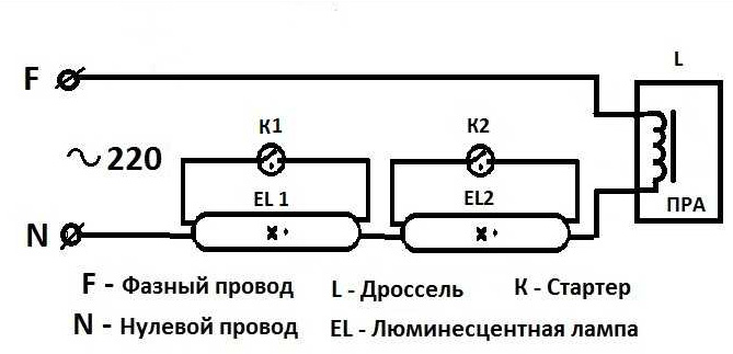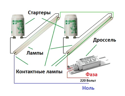 Considérez la connexion étape par étape de deux LL tubulaires au secteur à l'aide du circuit de démarrage. Pourquoi avez-vous besoin de 2 démarreurs, un composant d'étranglement, dont le type doit nécessairement correspondre au type d'ampoules.