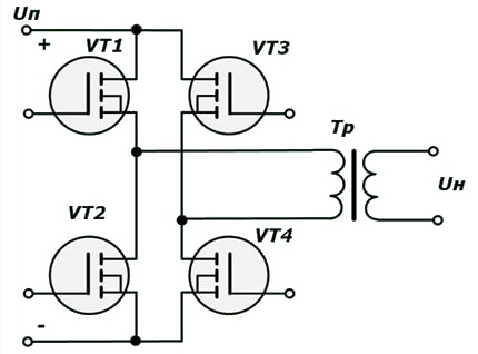 Le même principe s'applique approximativement au circuit en pont. La seule différence est qu'il n'utilise pas deux onduleurs, mais quatre transistors clés. En conséquence, le schéma est quelque peu compliqué, des éléments supplémentaires sont ajoutés.