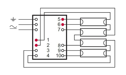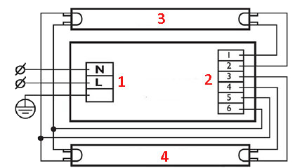 Selon la configuration du ballast électronique, une ou plusieurs lampes sont connectées. En règle générale, sur le boîtier de l'appareil de toute puissance, conçu pour connecter un nombre approprié de luminaires, il existe un schéma de circuit pour la mise sous tension.