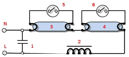Sur la base du même schéma, une solution est mise en œuvre avec le raccordement de deux lampes fluorescentes, une inductance et deux démarreurs. Certes, dans ce cas, il est nécessaire de sélectionner un réacteur de puissance en fonction de la puissance totale des appareils à gaz.