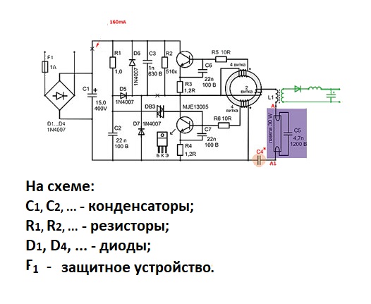 Considérez un diagramme schématique d'un ballast électronique demi-pont pour des lampes jusqu'à 30 watts. Ici, la tension du réseau est redressée par un assemblage de quatre diodes.