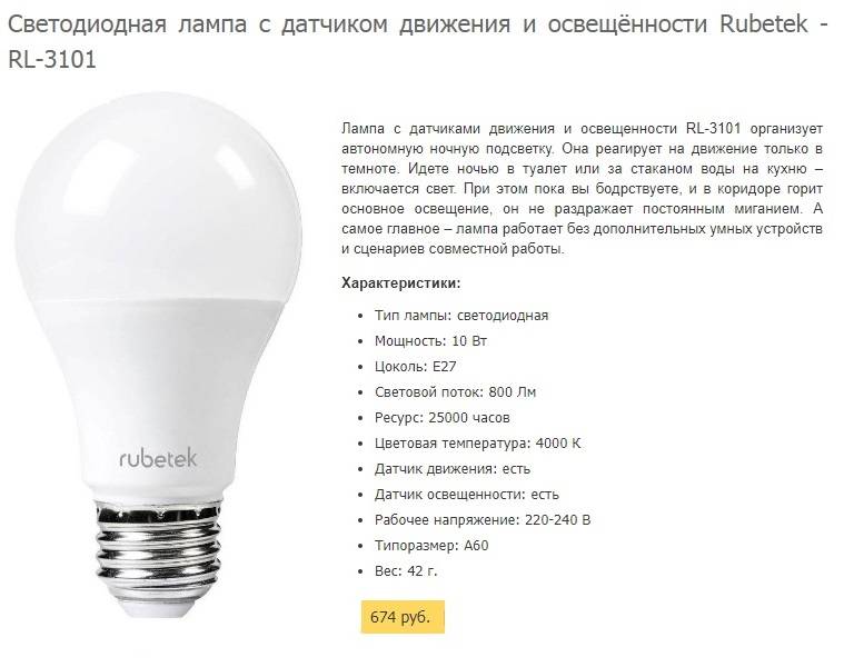 À propos de Pavel n'a pas entendu parler de la lampe LED ayant des capteurs de mouvement, l'éclairage? Et il y en a. Par exemple, Rubetek-RL-3101. Le principal avantage est qu'il ne brille pas lorsque l'éclairage principal du couloir ou suffisamment de lumière naturelle fonctionne. Comme il faisait noir, il commence à s'allumer, réagissant à celui qui passe. Ci-joint une capture d'écran avec les caractéristiques.
