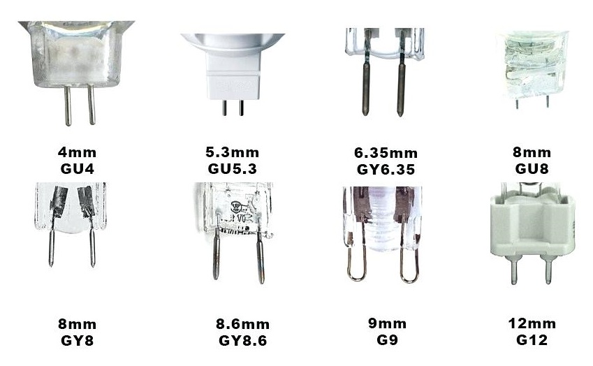 Les deux types d'halogène basse tension et de réflexe et de capsule sont équipés de casquettes type de broche. Ils se présentent sous plusieurs formes et sont équipés de marquages alphanumériques. Les chiffres indiquent la distance entre les deux broches, qui est exprimée en millimètres.