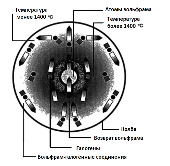 En conséquence, des halogénures de tungstène se forment qui ne se déposent pas sur les parois de la coque. Ils retournent au filament, où ils se décomposent en tungstène et halogènes, après quoi le cycle se répète.