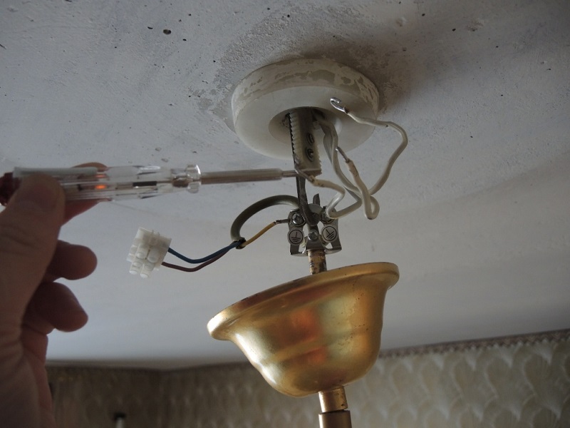 Après avoir retiré l'ancien appareil d'éclairage et libéré les fils, ils devront être soigneusement examinés pour détecter les dommages à l'isolation. S'il n'est pas cassé, vous devez les séparer dans des directions différentes et mettre sous tension pour vérifier avec un tournevis indicateur ou un multimètre l'accessoire de chacun des noyaux.
