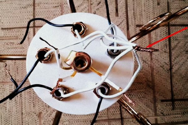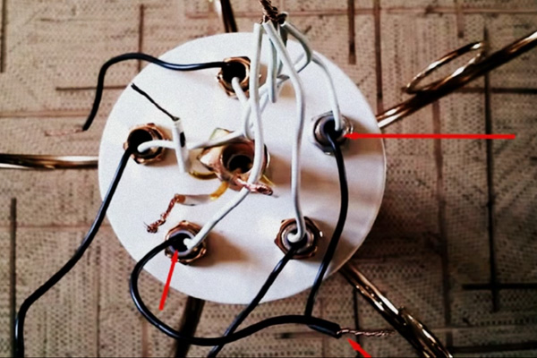 Vous pouvez commencer par le lustre lui-même. Elle laissera des fils de chaque cartouche et il peut encore y avoir un noyau central. Tout dépend du modèle.