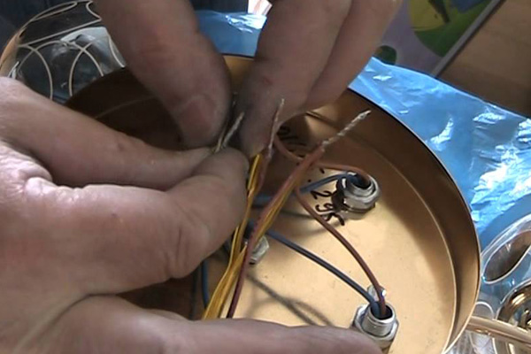 Après avoir vérifié les fils provenant du commutateur à deux gangs vers le lustre, vous pouvez continuer à le connecter. En principe, selon la couleur des fils sortant du mécanisme de travail, il est clair quels fils dépassent du plafond.