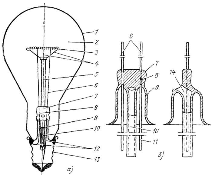Pour commencer à démonter l'intérieur de la lampe, il est nécessaire de se familiariser avec sa structure en termes généraux. L'élément principal est le corps incandescent, dont les extrémités maintiennent des électrodes sur eux.