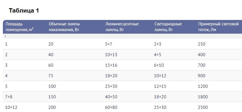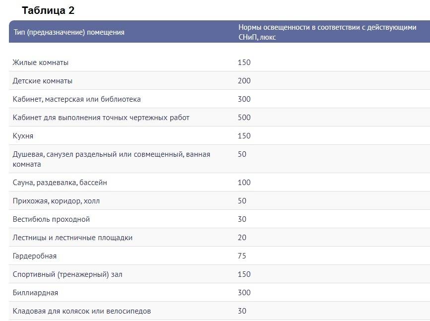 Des résultats plus précis peuvent être obtenus en se concentrant sur les normes d'éclairage pour différentes pièces - une capture d'écran de la table est jointe. En multipliant la norme d'éclairage par la surface de la pièce, vous obtenez le flux lumineux total requis. En le divisant par la valeur du flux d'une seule lampe de la première table, vous obtenez le nombre de lampes.