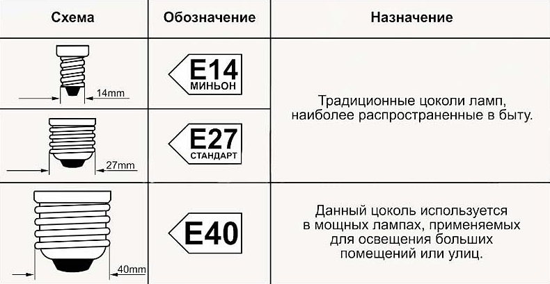 Le deuxième indicateur important à prendre en compte lors de l'achat est type de bouchon lampes à incandescence, déterminées par la taille. Les lampes LED importées et domestiques ont de nombreuses variétés de socles, tandis que les lampes simples sont limitées à trois.