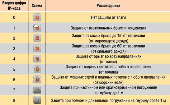 - Deuxième. Résistance à l'humidité sur une échelle de 0 à 8. Lorsqu'il est marqué du chiffre 8, le produit peut rester longtemps sous l'eau sans perdre ses fonctions, sans présenter de danger pour l'homme.