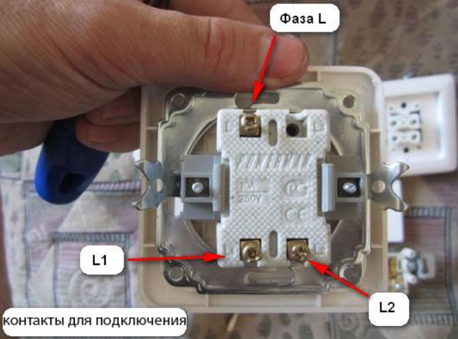 La désignation du terminal peut varier selon le fabricant. Dans ce commutateur chinois, le marquage est présenté comme suit: L - phase commune, phases sortantes L1 et L2
