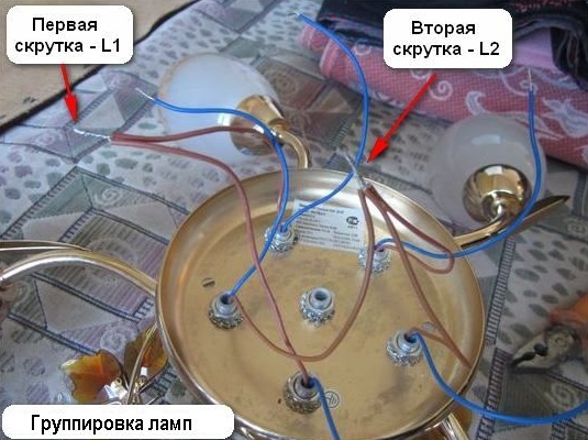 La plupart des lustres de fabrication chinoise ne sont pas équipés des connexions nécessaires, donc vous devrez d'abord déterminer combien de groupes les ampoules seront divisées. Chaque support de lampe a deux conducteurs de couleurs différentes - noir ou bleu et marron