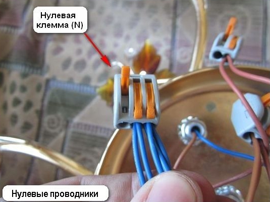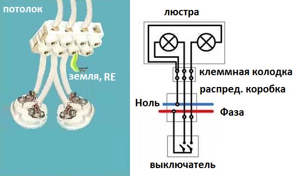 Dans la plupart des modèles de lustres avec deux groupes de lampes et de pièces métalliques, un bornier est fourni dans la configuration, à travers laquelle la connexion à la terre est effectuée.