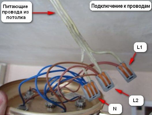 En conséquence, la sortie donne 3 nœuds de connexion: la phase des premier et deuxième groupes de lampes - L1 et L2, le nœud neutre commun - N. Compte tenu du marquage des fils, ils doivent être connectés aux lignes correspondantes au plafond.