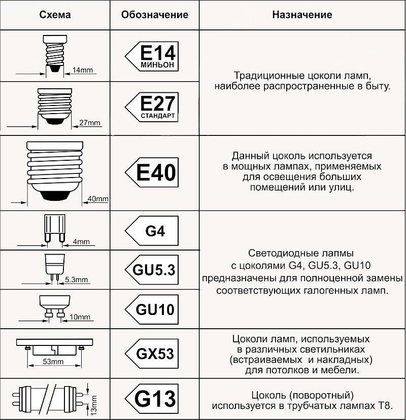 Le plus souvent, les appareils LED conçus pour une utilisation domestique et industrielle utilisent des bases filetées et des broches.