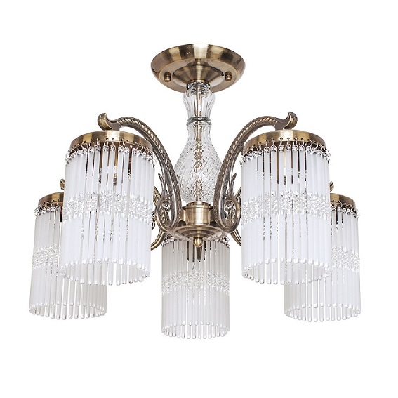 Le modèle est équipé de stores en verre semi-circulaires montés sur un cadre en métal massif. Le plafond principal dirige la lumière vers le haut, avec une inclinaison réglable - sur le côté. Le design, décoré dans des tons blancs et dorés, va bien avec le style Art Nouveau.
