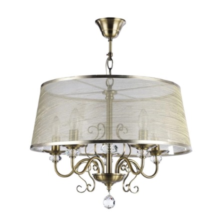 Comme sources lumineuses, 5 lampes à incandescence d'une puissance de 40 W chacune sont utiliséestype de base E14. Le modèle est également compatible avec les ampoules LED. Un lustre est monté sur un crochet au plafond, un petit bol de plafond cache la jonction des fils. Grâce à la chaîne de suspension réglable, vous pouvez définir une hauteur pratique à laquelle l'appareil sera situé.
