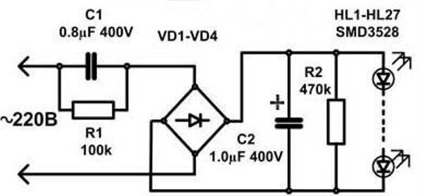 Pour éviter le scintillement inhérent aux lampes LED, le schéma décrit ci-dessus peut être complété par plusieurs détails. Ainsi, il devrait être composé d'un pont de diodes, de résistances 100 et 230 Ohm, de condensateurs 400 nF et 10 uF.