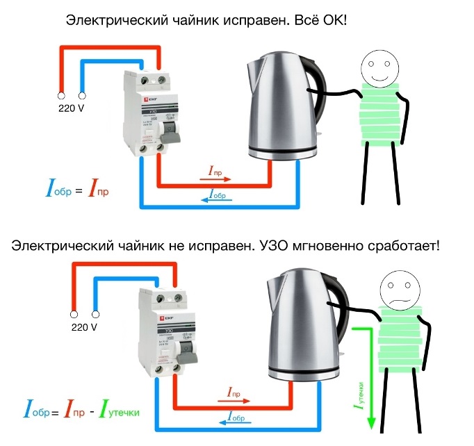 En mode de fonctionnement standard, le mouvement des électrons est effectué le long de la phase de ligne du câble entrant au radiateur électrique de la chaudière / bouilloire, traversant le dispositif de protection différentielle. De retour, ils reviennent au sol à travers le RCD, cependant, le long de la ligne neutre.