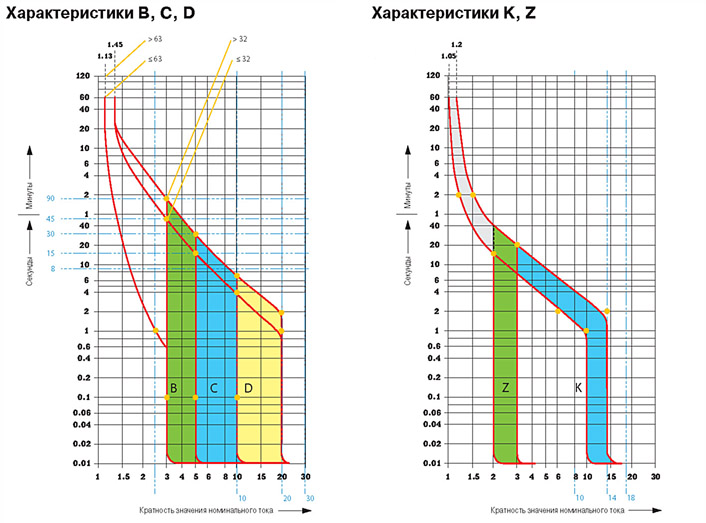 La ligne suivante est une combinaison d'une lettre latine et d'un chiffre. La lettre, debout en premier, indique simplement la caractéristique temps-courant. Il indique à quelle vitesse le disjoncteur se déclenche avec un certain courant qui le traverse. Il existe cinq types différents au total: "B", "C", "D", "K", "Z", cependant, les machines B, C, D sont utilisées dans la vie quotidienne.