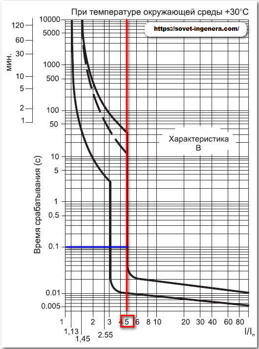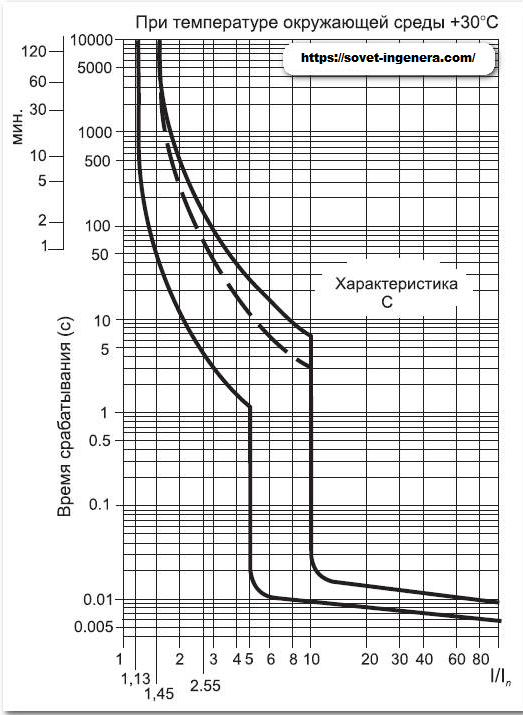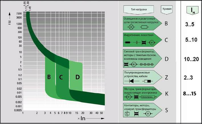 Le déclencheur électromagnétique d'un disjoncteur de classe B se déclenche lorsque le courant nominal est doublé en 0,015 seconde. Le déclencheur thermique répond en 4-5 secondes. avec un saut similaire. Alors que sur une machine de type C, un déclencheur électromagnétique se déclenche lorsque le courant nominal est cinq fois plus élevé en 0,022 seconde. Un déclencheur thermique répond en 1,5 seconde. avec un saut similaire.