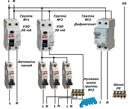 La construction d'un tel schéma implique, en règle générale, l'installation d'un dispositif de protection principal avec un courant de coupure de 100 à 300 mA. Et les dispositifs supplémentaires répartis sur des branches individuelles du circuit commun ont un courant de coupure ne dépassant pas 30 mA.