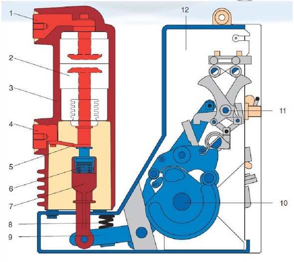 Les contacts mobiles des chambres à vide sont reliés mécaniquement à l'arbre de l'entraînement ressort-moteur. En raison du ressort de puissance préchargé (mis en tension), l'actionneur peut être facilement actionné en appuyant simplement sur le bouton de commande ou un autre mécanisme.