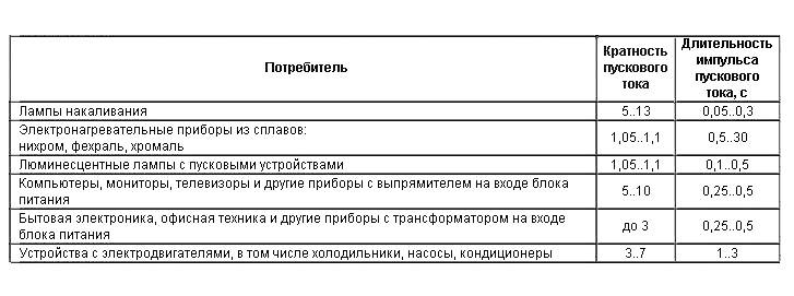 Selon le tableau, vous pouvez déterminer l'intensité du courant (en ampères) lorsque l'appareil est allumé, ainsi que la période pendant laquelle le courant de limitation se reproduira.