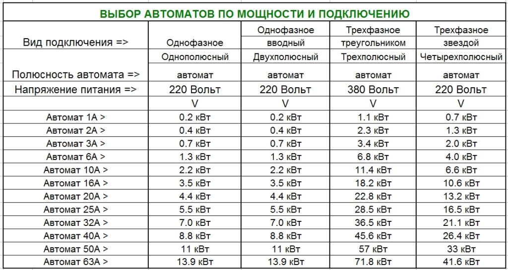 Si vous regardez le tableau des appareils automatiques en fonction de la puissance de connexion, prenez en compte que la tension de câblage standard dans les conditions domestiques est de 220 V, alors un disjoncteur unipolaire ou bipolaire 32A avec une puissance totale de 7 kW convient pour le fonctionnement.
