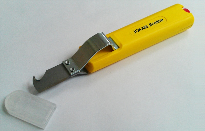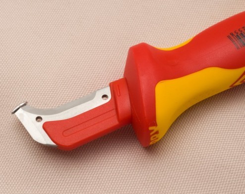 Couteau avec un crochet. Un tel outil est capable de sectionner et de couper longitudinalement le câble. Le fil est fixé sur le dessus avec un support et un croc pointu traverse l'isolation.