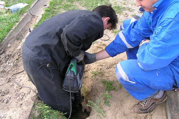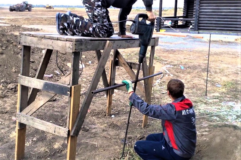 Le terrassement est réduit à extraire un trou de dimensions 0,5 * 0,5 * 0,4 m.Il n'est pas recommandé d'utiliser un marteau perforateur pour marteler une broche, car la rotation de la tête de broche doit être exclue. Ici, vous avez besoin d'un marteau avec une buse spéciale.