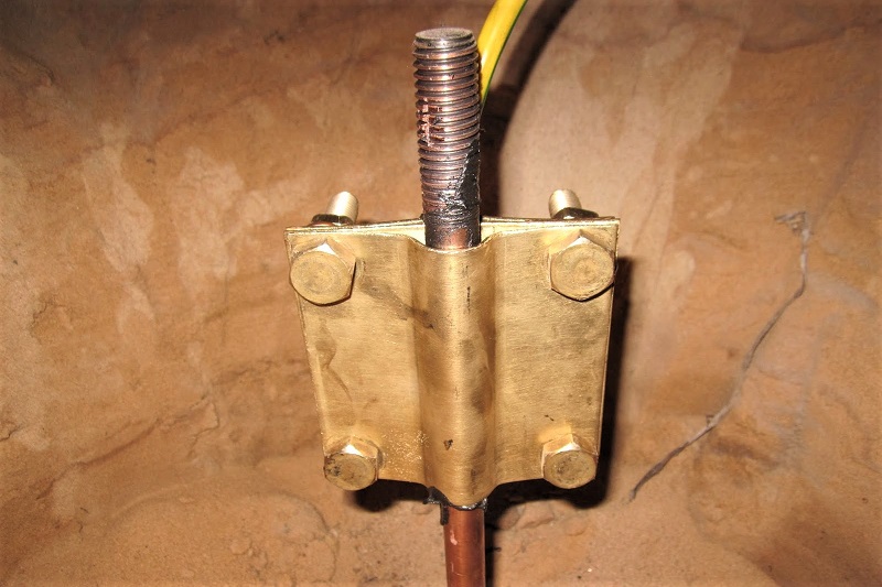 Ensuite, nous connectons le conducteur de mise à la terre à la structure: nous pressons son extrémité avec une pointe ronde et, à l'aide d'un boulon de taille appropriée, le fixons au trou percé dans l'un des coins.