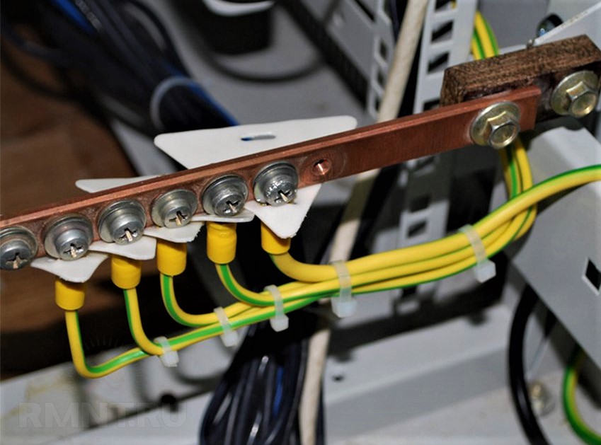 Fil de terre - un conducteur en cuivre de section égale à celle du noyau de phase. Il est connecté à une extrémité à un bus situé dans le panneau électrique et à l'autre extrémité à un conducteur de mise à la terre enfoui dans le sol. Les conducteurs de mise à la terre de toutes les installations électriques de la maison mènent également au bus.