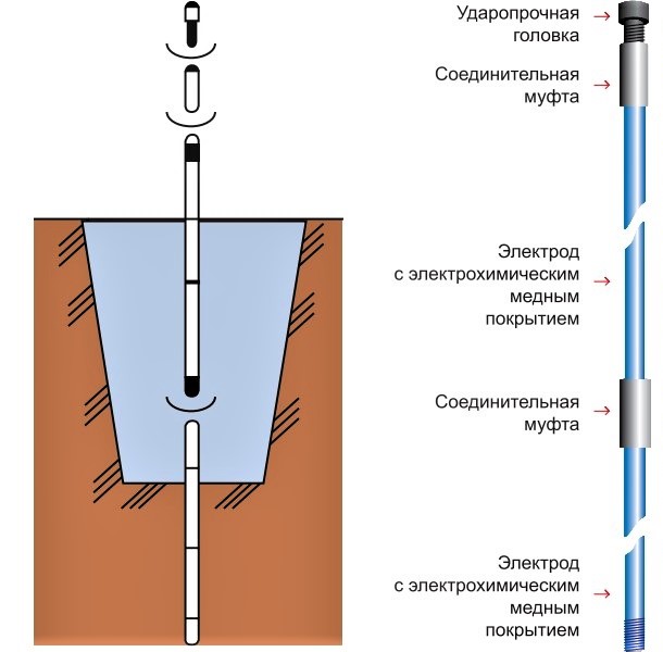 Dans une conception artisanale, la zone de contact avec le sol augmente en raison de l'utilisation de plusieurs coins.Il n'y a qu'une seule broche, donc l'augmentation du contact se produit en raison de sa longueur. L'appareil est enfoncé dans le sol à une profondeur de 20 à 40 m.